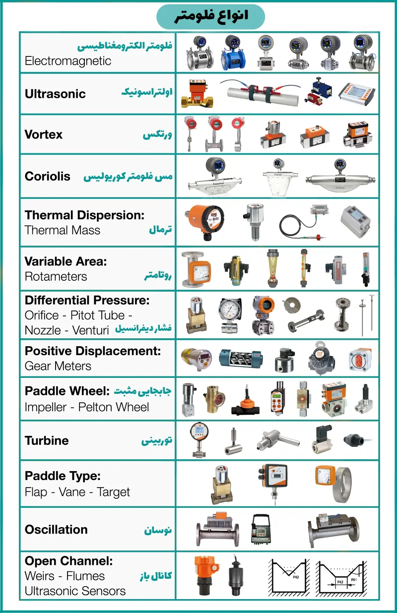فلومترها بر اساس مکانیزم اندازهگیری به دستههای مختلفی تقسیم میشوند. در ادامه به بررسی جزئیات انواع فلومترها و کاربردهای آنها میپردازیم: